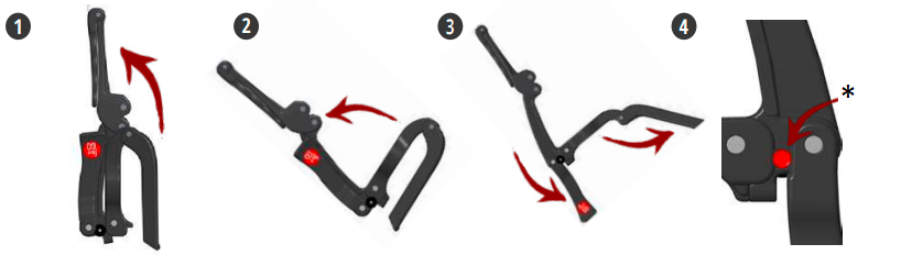 ٣. أنزِل العمود الخلفي والساقين - أنزِل العمود الخلفي، الذي يحمل الشعار، بيدك اليسرى. يُصدر القفل الدائري الأسود صوت طقطقة عند تثبيته. أنزِل الساقين.