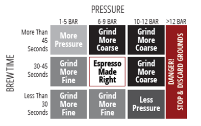 | يبدأ كل شيء بالطحن الصحيح وكمية كافية من القهوة، مما يُوفر مقاومة لتحقيق الضغط ووقت التخمير المطلوبين. سيُحضّر "المُبدعون" المُتقنون هذه التقنية قهوة إسبريسو بضغط يتراوح بين 6 و9 بار في غضون 30-45 ثانية. ماكينة Flair 58 مُجهزة بمقياس ضغط لضمان الحصول على قهوة إسبريسو مطابقة لمواصفاتك. استخدم الجدول التالي لمساعدتك في الإعدادات. | ![]() |