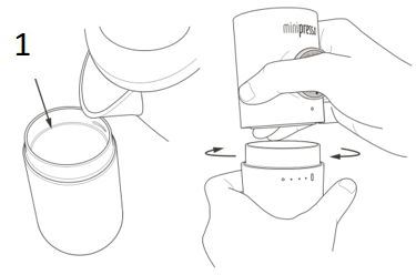 املأ خزان الماء حسب مستوى الخطورة. حَاذِ جسم MiniPresso مع النقطة الموجودة على الخزان، ثم ضعه عليه بتدويره باتجاه عقارب الساعة.